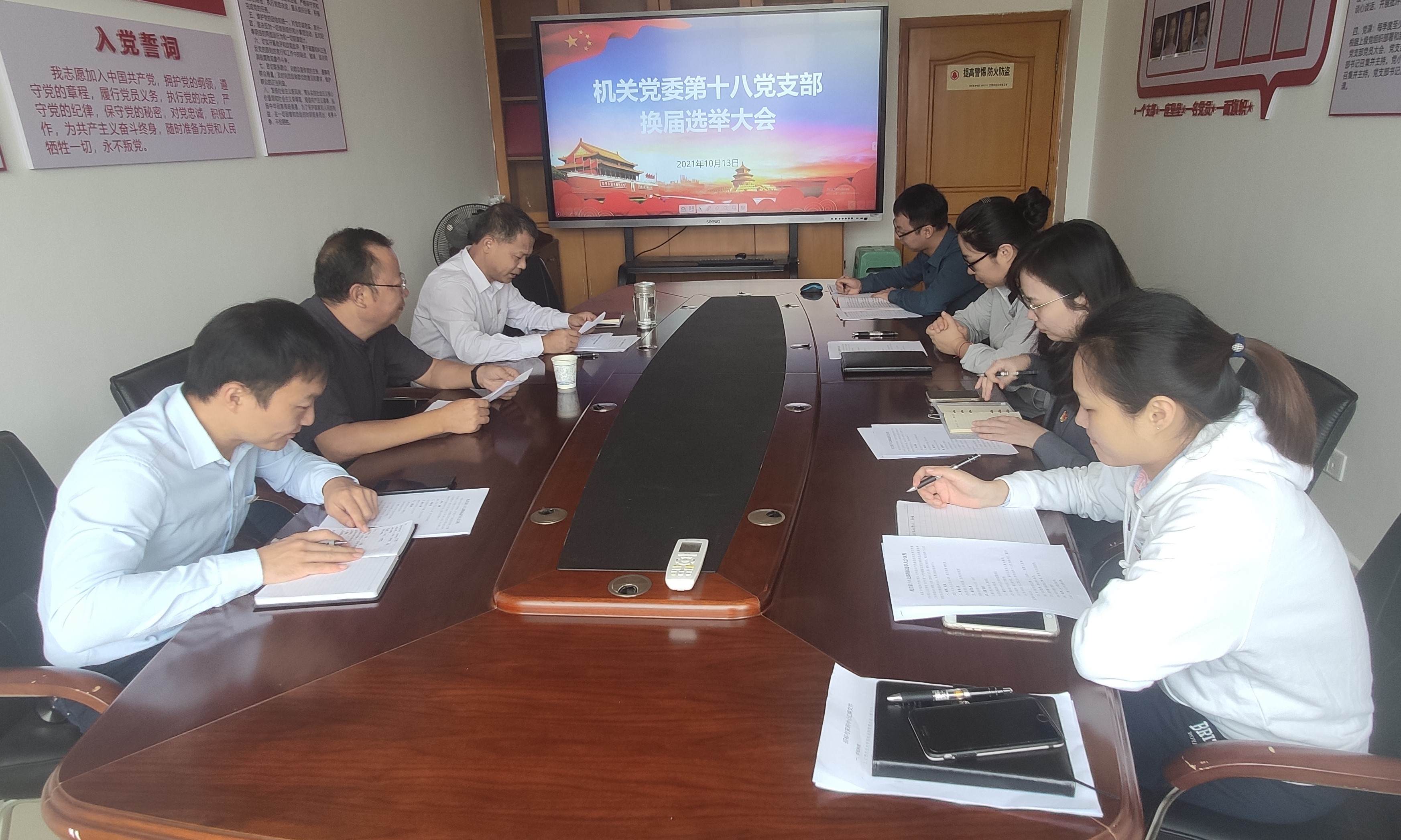 10月13日,机关第十八支部召开换届选举大会。肖明同志当选支部书记,李春晓同志当选支部副书记。机关党委委员李剑富到会指导。