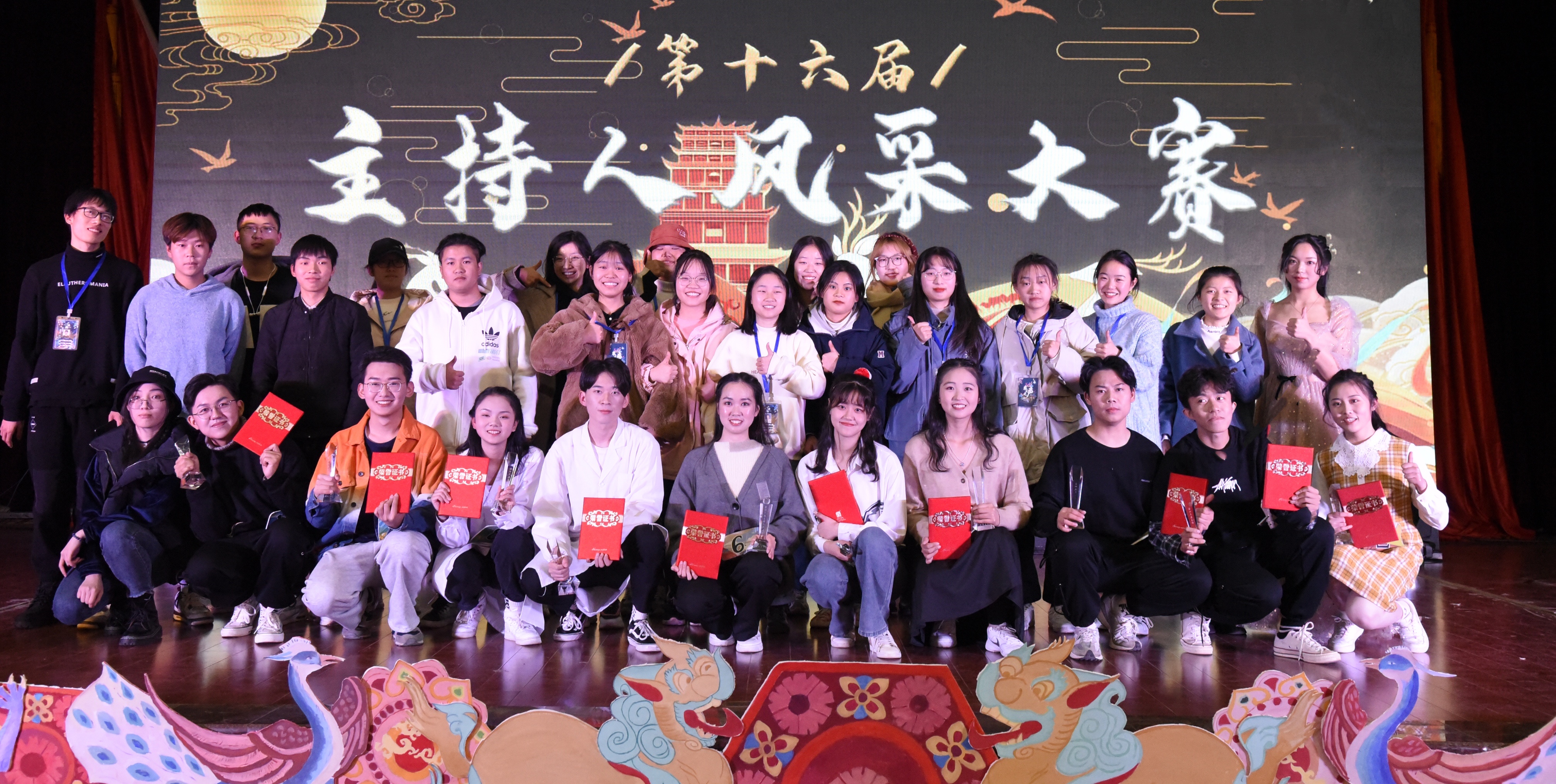 经过三轮比赛的激烈角逐,来自国土资源与环境学院的孙一凡荣获得金话筒,外国语学院的付一凡获最佳台风奖,外国语学院的白家奇获最佳人气奖,生物科学与工程学院的何妍卉、人文与公共管理学院蒋文涛、食品科学与工程学院王雨欣、农学院严逸飞、动物科学技术学院万乐、动物科学技术学院蔡敏敏、国土资源与环境学院谢东睿获十佳主持人奖。