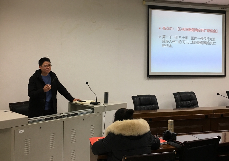 法学系教工党支部书记、系主任徐瑾从《民法典》的立法背景、立法意义入手,着重解读了《民法典》的35个亮点。徐瑾在讲解中列举大量生动具体的案例,深入浅出地讲解了《民法典》的有关法条,引起了听众的热烈反响、提问讨论。大家深刻感受到《民法典》贯彻了以人民为中心的发展思想,把人民群众的所思所想所急所盼写进了法律条文中,镌刻在法典上,“是一部固根本,稳预期、利长远的基础性法律”。