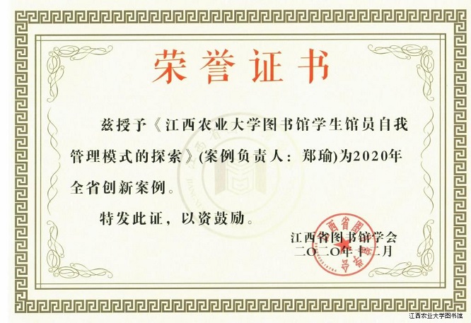 12月8日,由江西省图书馆学会举办的2020江西图书馆年会在江西省图书馆新馆召开。来自全省图书情报界的代表、学会会员、论文作者共200多人参加会议。大会对全民阅读先进单位和个人、创新案例等进行了表彰,图书馆报送的管理创新案例《ac米兰官网中文网站图书馆学生馆员自我管理模式的探索》入选2020年全省图书情报界十大创新案例。