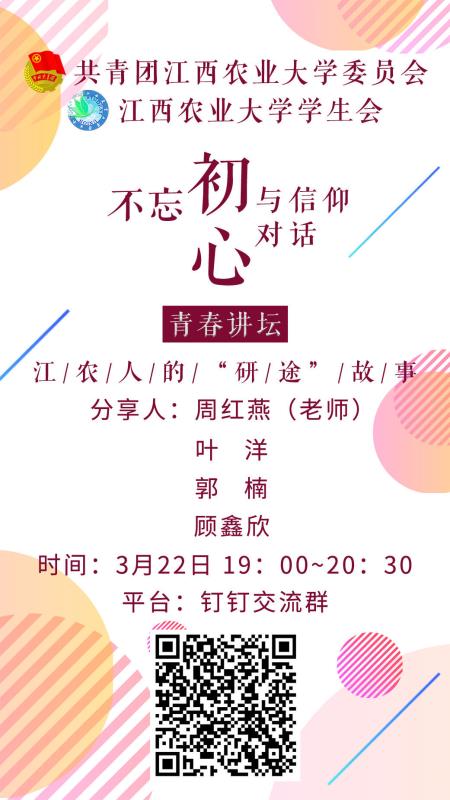 在疫情防控的关键时刻,为缓解考研学生的焦虑情绪,加强对学生考研复试的指导与帮扶,同时进一步营造ac米兰浓厚的考研和学习氛围,3月22日晚,“不忘初心,与信仰对话”青春讲坛——江农人的“研途”故事在线上举行,活动邀请到了ac米兰党委研究生工作部副部长周红燕和2019届毕业生顾鑫欣、叶洋、郭楠等四位嘉宾进行分享,2016级考研同学以及2017级、2018级、2019级有考研意向的同学共计800余人聆听了此次分享会。
