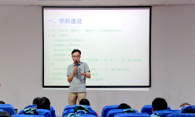 院长胡国良代表学院对2018级新生表示热烈欢迎,向新生详细介绍了学校百年校史、学院八十年发展历程和教学科研、杰出校友等情况,鼓励新生要秉承优良院风,早日规划好人生目标,刻苦学习,为做社会有用之才打下坚实基础。舒邓群教授、邓舜洲教授、刘宝生副教授和熊六凤副教授分别代表动物科学、动物医学、动物药学及水产养殖学四个专业,从师资队伍、教学实践、学科建设、专业前景、兴趣小组活动等方面进行了详细介绍。