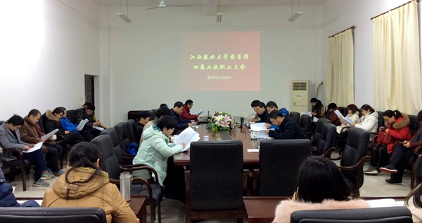1月25日,图书馆四届二次职工大会在逸夫图书馆会议室召开,图书馆全体正式职工和聘用工代表参加了会议。