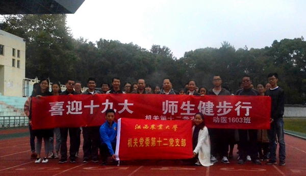 10月15日,为迎接党的十九大胜利召开,推进机关支部联系班级工作,机关第十二党支部党员与联系班级动医1603班同学在学校北区田径场举行了“喜迎十九大,师生健步行”主题党日活动。