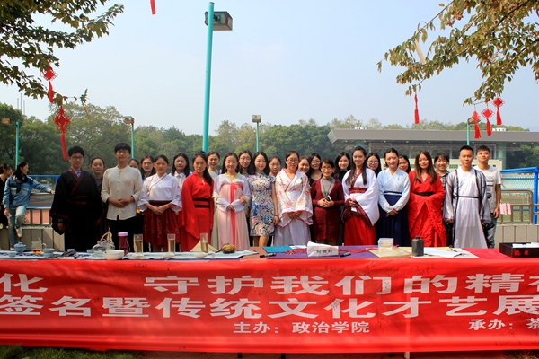 文化兴国运兴,文化强民族强。10月22日,在党的十九大胜利召开的喜庆氛围里,政治学院以“亲近中华优秀传统文化,守护我们的精神家园”为主题,在校园北区大学生活动中心室外举办了弘扬优秀传统文化签名暨传统文化才艺展示活动。此次活动由政治学院硕士生导师赵美岚老师创意策划,政治学院全体研究生组织参与,并在ac米兰官网中文网站大学生茶艺社、墨韵书法协会倾情协助下顺利开展。