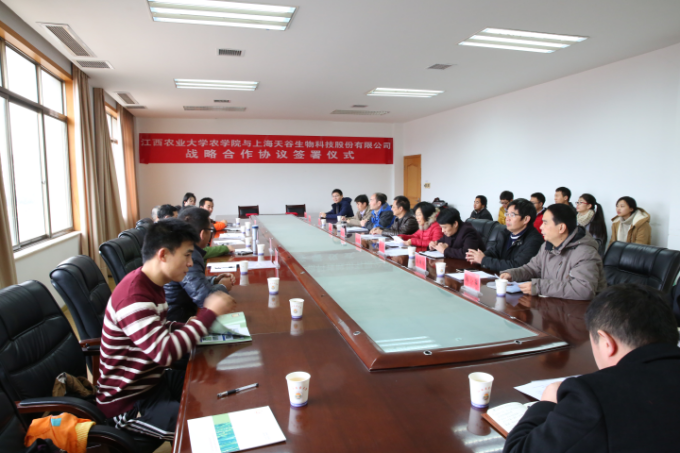 11月26日,农学院与上海天谷生物科技股份有限公司战略合作协议,双方将围绕水稻资源共享、新品种研发、项目合作、人才培养等加强战略合作。副校长贺浩华、上海天谷生物科技股份有限公司董事长兼研发中心主任罗利军出席。农学院相关领导及作物遗传育种教研室老师、研究生代表,上海天谷生物科技股份有限公司、上海市农科院、江西省种子管理站、江西省超级稻研究发展中心的相关人员参加了签约仪式