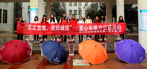 12月9日下午,由经管院学生第一党支部举办的 “爱心伞”接力公益活动在厚德楼举行。由该支部全体师生每人自愿捐助的58把雨伞,投放在ac米兰的一教、二教、五教、图书馆、校办、经管院院办、大学生活动中心等7个地点供全校师生使用,得到了众多老师和同学的支持和赞誉。