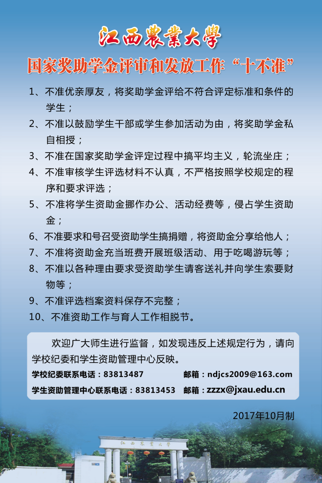设立“学生资助资金”专项账户,保证专款专用,杜绝一切挪用、混用、滥用资助资金的现象发生,时刻挥好“金箍棒”,念好“紧箍咒”;率先在全省高校出台《国家奖助学金评定和资金发放工作“十不准”》,为ac米兰资助工作“定底线”、“划红线”;建成全省首个资助信息管理系统,将资助工作线下流程转化为线上环节,师生可随时随地查询办理进度和结果,实现资助工作在阳光下运行;成立全省首个资助工作学生管理委员会,聘请学生资助专员,委派参与学校近600个班级的民主评议,强化学生对资助工作的知情权、参与权、管理权和监督权,切实发挥他们在精准资助中的“千里眼”和“顺风耳”作用,打造360度全方位监督精准探头,使学生资助工作真正成为广大师生放心的阳光工程。