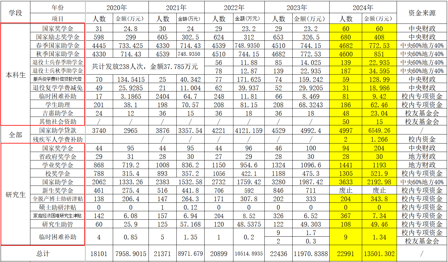 学生资助工作政策性强、覆盖面广,需要完善的资助制度作为基础和保障。2024年,学校修订出台了《本科生国家奖助学金管理暂行办法》《校内勤工助学实施细则》《学生临时困难补助管理办法》等一系列制度,为学生资助工作更加科学化、规范化奠定了坚实的基础;完善勤工助学学生考核制度,对每位学生实行到岗签到、月末考核、期末评优,真正发挥岗位的育人作用;着眼于学生资助工作的管理需求,打造“学校领导、部门统筹、学院负责、班为单位、全员参与”的工作体制,构建个人—班级—学院—学校四级资助体系,明确了从个人、班级、经学院到学校的全链条资助工作职责和操作流程。全年共完成本科生和研究生的奖、助、贷、勤、补、免等资助项目的评选、审核和资金发放超过1.3亿元,覆盖学生超2.3万人次。