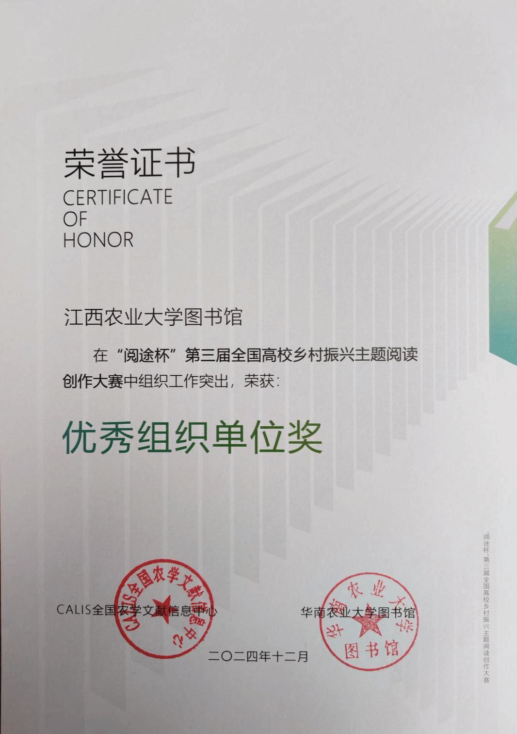近日,由CALIS全国农学文献信息中心与华南农业大学图书馆联合主办的“阅途杯”第三届全国高校乡村振兴主题阅读创作大赛圆满落幕,ac米兰图书馆表现突出,荣获“优秀组织单位奖”,蔡志强、卢平英和许建红三位老师获得“优秀组织个人奖”。