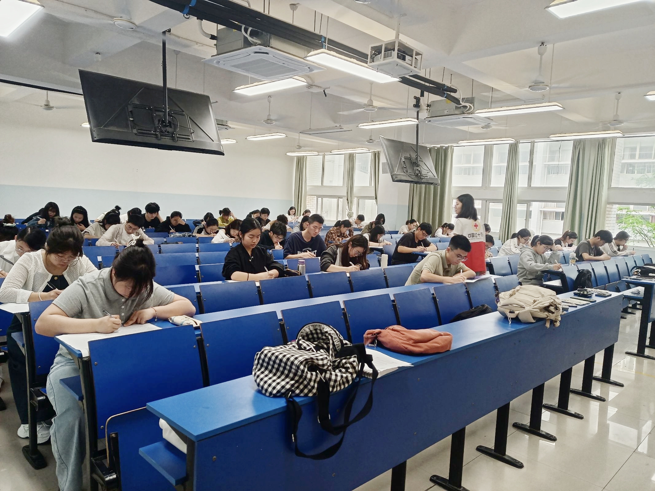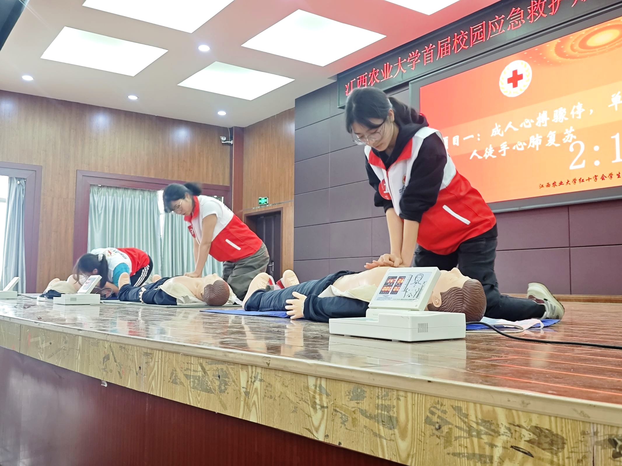 大赛以“实操培训+理论考核+实操演练”的形式,吸引了全校200余名学生参与。赛前,ac米兰官网中文网站红十字会学生分会开展两轮集中培训,围绕心肺复苏、螺旋反折包扎等急救核心技能进行强化训练,为比赛筑牢实操基础。比赛分为理论考核和实操演练两部分,理论部分采用闭卷答题形式,涵盖红十字运动基本知识、救护相关知识、心肺复苏、创伤救护等内容;实操环节高度还原真实急救场景,模拟成人心肺复苏、左前臂出血处理以及头顶帽式包扎等实突发状况。此外,大赛还设置观众互动环节,大屏幕上播放真实现场急救视频,让大家直观感受到急救在关键时刻的重要性;应急救护小知识抢答环节,同学们积极举手,争相答题,现场气氛热烈。