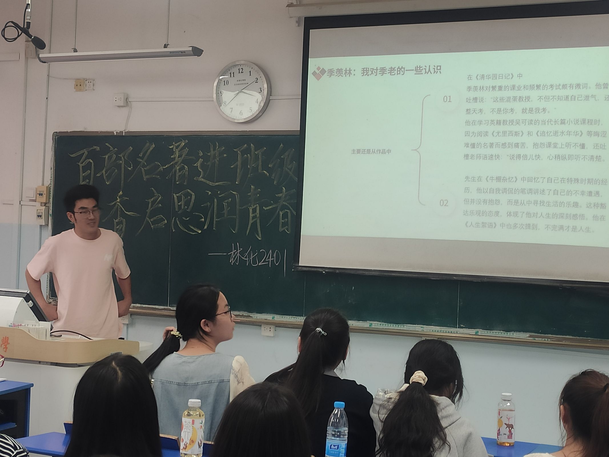 活动中,林化2401班学生代表以《在细雨中呼喊》主要人物关系和命运、《基督山伯爵》的故事概要、《红楼梦》中刘姥姥角色分析、《牛棚杂记》的时代背景、《我们为什么要睡觉》里的科学知识、《明朝那些事》核心人物朱元璋的功过评价为题,分享了他们的阅读心得体会。