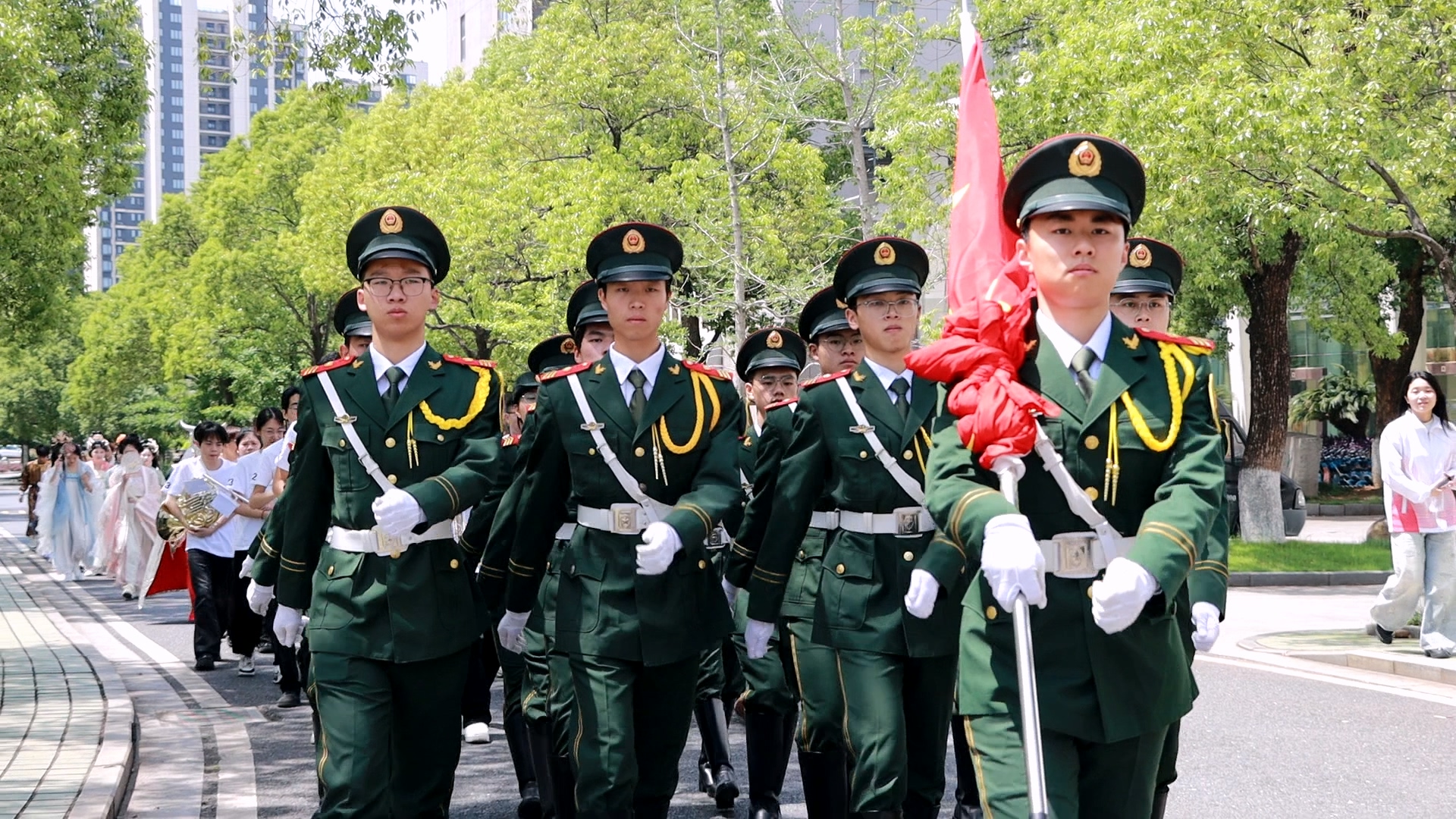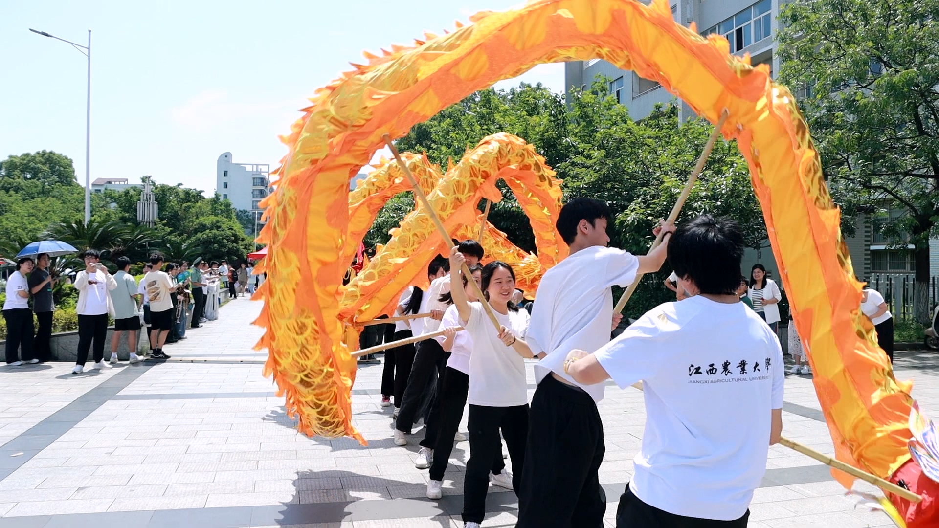 花漾巡游 社汇青春。当激昂的号角声响起,舞龙、国旗仪仗队、军乐团、汉服等组成特色文化方阵,沿五教广场进行巡游。他们将现代元素融入传统文化,整齐划一的步伐、绚丽多彩的服饰、朝气蓬勃的精神面貌,吸引众多师生驻足观看,纷纷记录下这道充满青春气息的校园风景线。