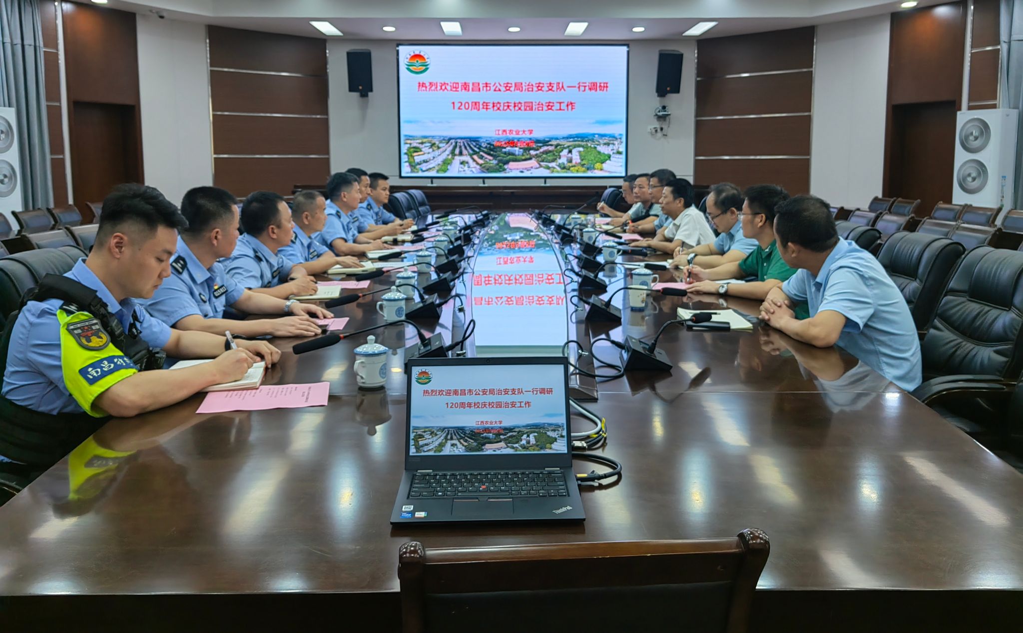 会上,游金明对张小泉一行的到来表示热烈欢迎,对南昌市公安部门长期以来对学校的支持帮助表示衷心感谢。校庆筹备办、保卫处分别就校庆整体筹备情况、活动安排及安保方案作了介绍,并就校园周边交通疏导、校内总体治安管控等提出工作需求。张小泉充分肯定了学校在校庆筹备过程中对安保工作的重视,从专业角度分析了校庆期间潜在的治安风险,并提出针对性指导意见。张小泉表示,支队将全力支持学校安保工作,筑牢校园安全防线。