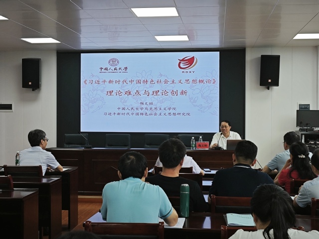 陶文昭以《习近平新时代中国特色社会主义思想概论》的理论难点与理论创新为题,以习近平新时代中国特色社会主义思想和习近平总书记系列重要讲话精神为根本遵循,从教材参编专家和思政课教师的双重视角,带领大家逐章学习“习近平新时代中国特色社会主义思想概论”的理论难点、理论创新,并就如何讲准、讲深、讲透、讲活党的创新理论和讲好思政课进行针对性指导。同时,陶文昭还分享了参与高校思想政治理论课程教材编纂工作的亲身感受。