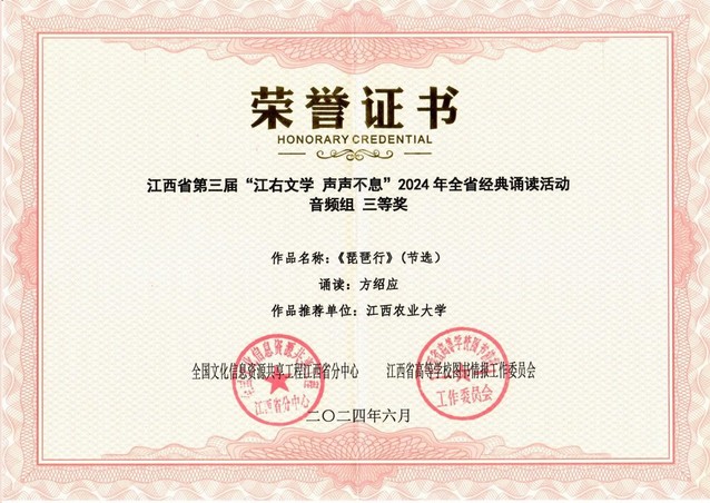 近日,江西省第三届“江右文学 声声不息”经典诵读活动评选结果正式出炉。经过激烈角逐,人文与公共管理学院汉语言文学2201班方绍应同学荣获音频组三等奖,校图书馆荣获优秀组织单位。
