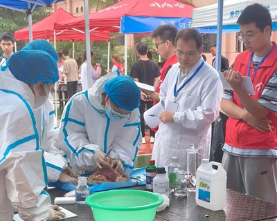 本次大赛分为笔试初赛和操作决赛两个阶段。经过两个多月的精心筹备,27支队伍共99人闯入决赛。大赛涉及学院2021级和2022级各专业学生,设置专业一组、专业二组、专业三组和非专业组,现场操作考核包括兔的胃切开、掺假鱼粉的鉴定、鸡的精液采集、品质检测及人工授精等比赛内容。赛场中各团队凭借扎实的专业知识,过硬的操作技能,娴熟的团队合作,有条不紊地完成各项实验操作。