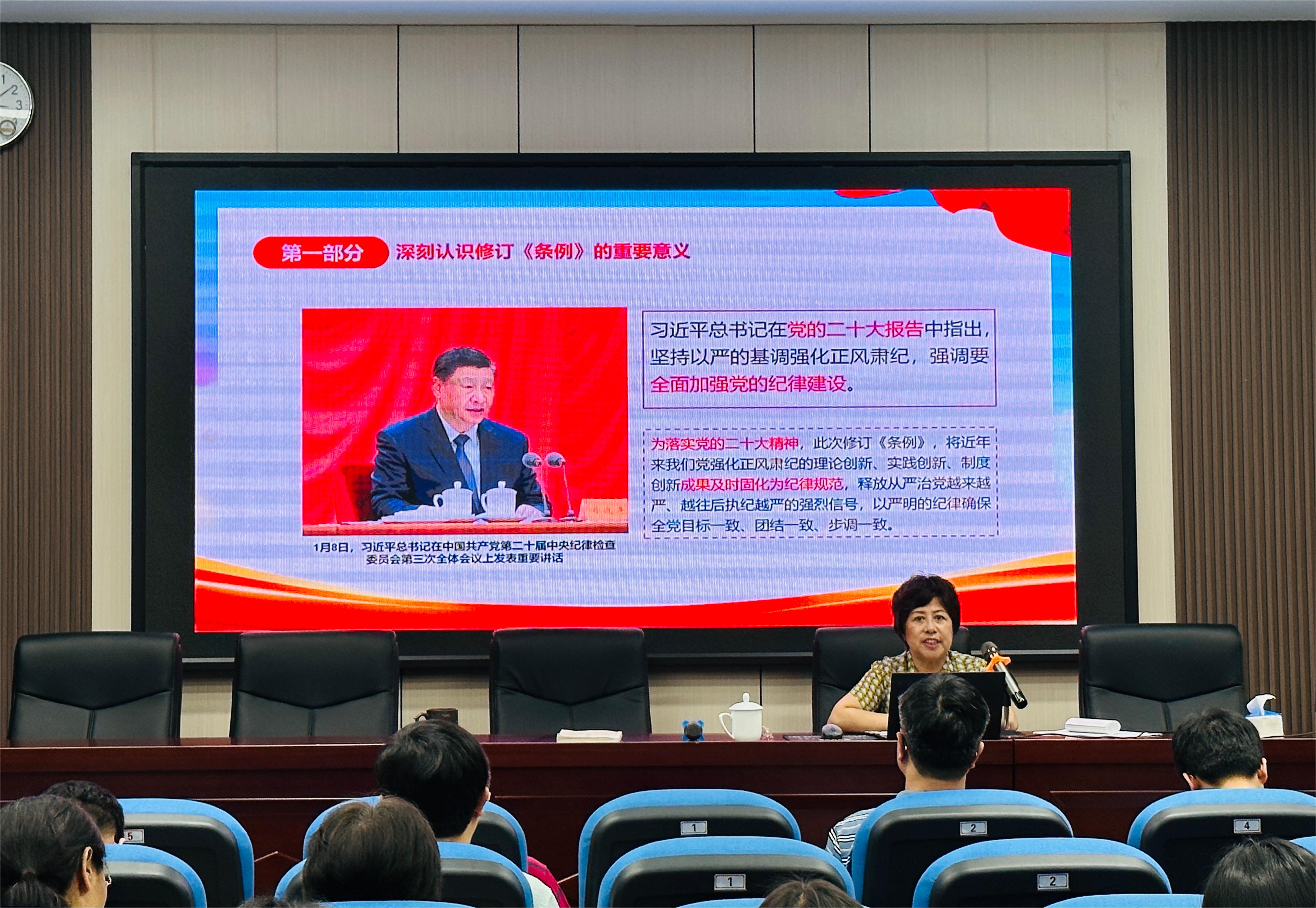 乔金霞从深刻认识修订《条例》的重要意义、准确把握《条例》修订的主要内容、高度重视《条例》修订后与我们的日常工作和生活紧密相联的内容三个篇章,对《中国共产党纪律处分条例》的具体内容进行专题讲授,并结合工作实际举例,带领党员深刻领悟了《条例》的精神实质和具体要求,引导党员干部从严从实,检身正己。