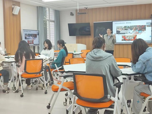 课堂上,学生代表围绕中华优秀传统文化、革命文化、社会主义先进文化进行了分享。师生们还围绕提升我国文化软实力、传承红色基因等展开了互动交流。