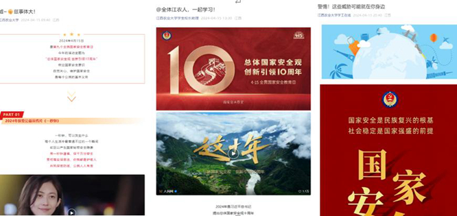 线上线下齐发力,烘托好宣教氛围。国家安全教育,是高校安全教育的重要组成部分,学校历来重视国安教育氛围打造。今年自3月下旬至今,学校党委宣传部官方媒体、学工部官方媒体、各个教学学院分团委、部分学生社团、相关机关处室,利用传统媒体和网络媒体,适时开展了国家安全多角度多方面宣传,将国安主题见网络微信端宣传、见校园线下宣传、见电子大屏视频宣传,积极营造“人人知国安、人人参与国安、国安护人人”的良好宣传教育氛围,整个校园“浸润”在国家安全教育日浓厚氛围中。