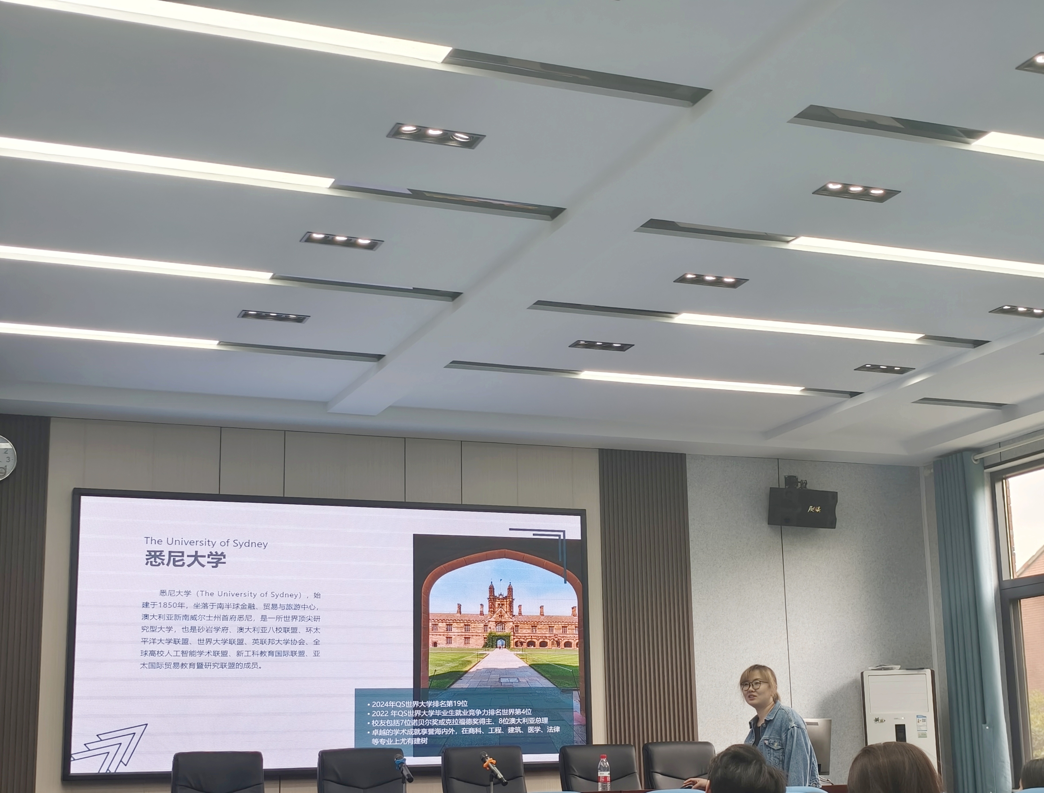宣讲会上,暑期海外名校线下交流项目专员向同学介绍了包括美国哈佛大学、麻省理工学院、英国剑桥大学、澳大利亚悉尼大学、昆士兰大学等诸多世界顶级名校的暑期短期访学项目。学生利用暑期时间赴海外名校学习,课程包括创新管理与决策思维、先进的机器学习、数据挖掘与人工智能、金融会计与财务分析等综合素质培养课程。项目为学生提供官方结业证书和成绩评定单,成绩优异的同学还有机会获得教授推荐信。暑假港澳名校访学实践/香港名企实习交流项目专员介绍了港澳交流项目的基本情况、教学内容、访问高校、实践活动、学习收获以及项目的时间安排,并对学生提出的问题进行了仔细解答。外国语学院刘珺懿同学分享了今年寒假赴昆士兰大学的研学经历,她表示亲身体验昆士兰大学这座历史悠久的学府,可以深切感受到不同思想的碰撞以及智慧的火花。