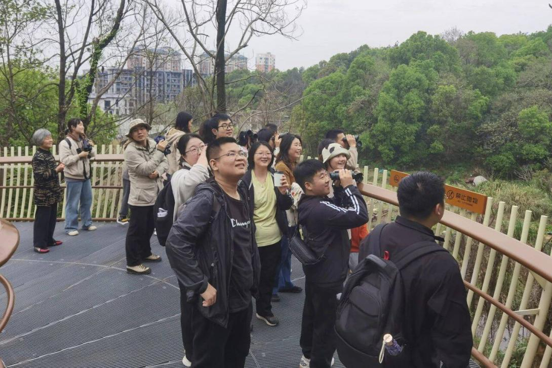 在校外,野鸟学会联合江西省观鸟协会在磨盘山森林公园举办“寻鸟体验赛”,百余名南昌市市民参与到活动中来。同学们带领市民朋友在磨盘山森林公园中观鸟,为其讲述鸟类知识,宣传爱鸟护鸟知识,讲解“爱鸟周”由来。