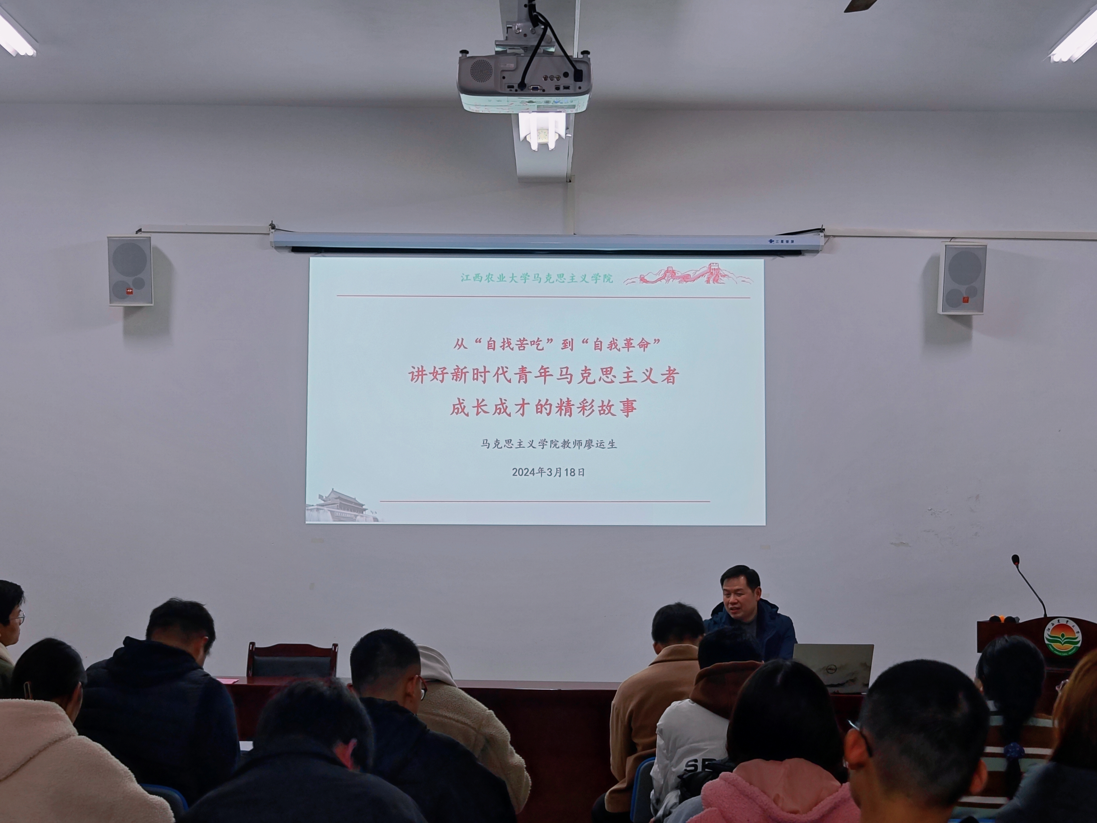 学校“金扁担”宣讲团成员、博士宣讲团成员、马克思主义学院副教授廖运生应邀为全体团员授课。廖运生以《从“自找苦吃”到“自我革命”,讲好新时代青年马克思主义者成长成才的精彩故事》为题,用生动的语言、翔实的数据和形象的案例给全体团员上了一堂思政课、一堂示范课、一堂培训课。他深刻诠释了理论宣讲要“怎么讲”“讲什么”“和谁讲”,要通过加强自身学习,不断增长脑力;注重锻炼,增长笔力;把握方向,增长眼力。以身边人讲好身边事,以身边事激励身边人,考察借鉴先进经验和优秀成果,砥砺“自找苦吃”的精气神,提升理论素养和宣讲水平,做好兼具思想性、理论性、针对性和亲和力的宣讲。
