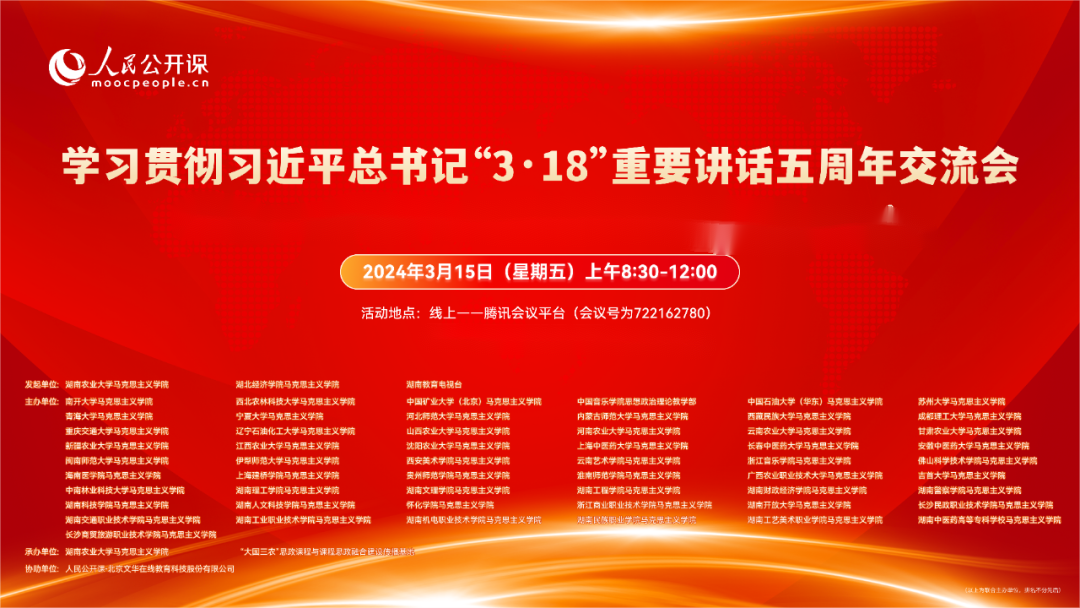 在习近平总书记“3•18”重要讲话五周年到来之际,为深入贯彻习近平总书记关于思政课建设的重要论述,3月15日上午,ac米兰马克思主义学院协同全国58所高校马克思主义学院,共同推出学习贯彻习近平总书记“3•18”重要讲话五周年线上交流会。全国58所高校马克思主义学院协同参与交流会。活动以“线上+线下”联通、“主会场+分会场”联同、“思政+三农+艺术”虚拟教研室联建的方式展开,活动主会场设在湖南农业大学马克思主义学院,各地各校马克思主义学院设分会场,湖南农业大学马克思主义学院院长胡艺华教授主持。