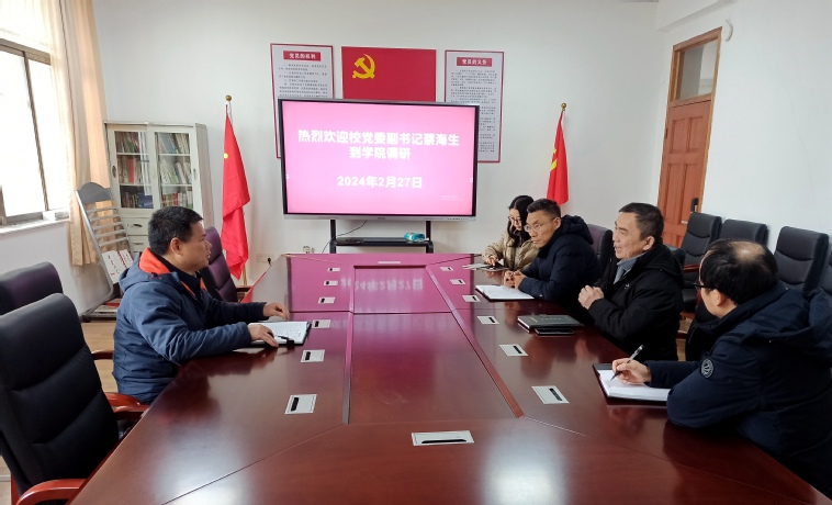 蔡海生认真听取了学院工作的汇报,详细询问了学院新学期的课堂教学组织情况、师生到岗到校情况,对学院取得的成绩予以肯定,对新学期学院工作进行了具体指导。他强调,新学期新气象,今年是全面贯彻落实党的二十大精神关键之年,是大抓落实年,是提升服务质量年,学院工作要围绕中心、服务大局、主动谋划,明方向、定目标,明举措、定方案,求实效、抓落实。一是着力提升学院教育教学质量。要加强师资队伍建设和管理,加强师德师风建设,发挥教师工作积极性,认真抓好学科评估、本科专业评估工作。二是要着力抓好就业工作。要千方百计为学生的升学、就业提供更多的服务,保障学生的充分就业。三是要着力抓好人才工作。要下大力气加强人才引进力度,夯实学院高质量发展的人才基础。四是着力抓好学院党建工作。要严把党员发展质量关,发挥好党员的先锋模范作用,积极推进党建品牌建设。五是着力抓好学院平安建设。要加强安全教育宣传,以清单制落实落细大学生思想政治教育管理,以有力措施切实维护学院安全稳定。六是着力抓好学院基础建设,要加快学院实验室项目的建设进度,为学院完成各项重要任务提供良好的条件保障。