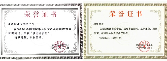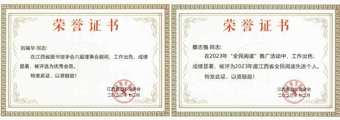 会上对我省图书馆事业中做出突出贡献的学会、会员单位、会员、学会工作者进行了表彰,ac米兰图书馆获“征文组织奖”、郑瑜获“优秀学会工作者”、刘瑞华获“优秀会员”、蔡志强获“2023年度江西省全民阅读先进个人”。