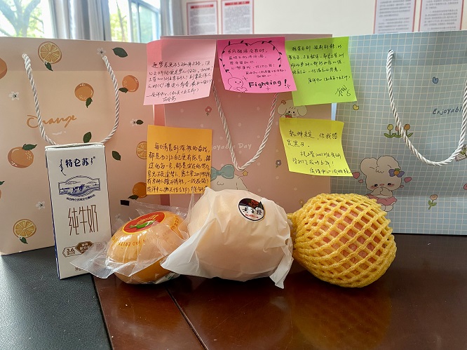 活动中,党员教师们将精心准备好的“考研爱心袋”派发到每一位考研学子手中。爱心袋中有橙子、柿子、苹果、牛奶和党员老师们手写的励志标语,象征着“心想事成,事事如意,平平安安”的美好寓意。支部书记亲切与学生交流,关心询问学生学习及生活情况,鼓舞考研学子的士气,并祝愿大家考试顺利,一战成硕。