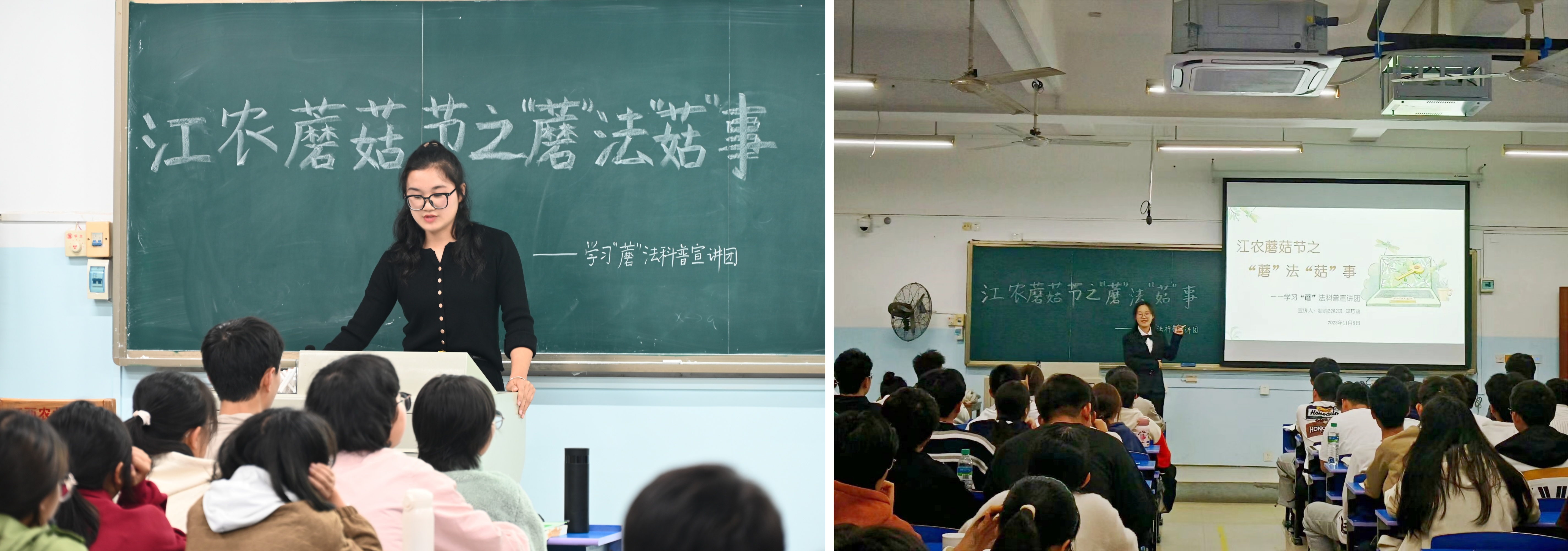 “学习‘蘑’法科普宣讲团”以教师党员、学生为主体,通过科普进课堂、讲座、论坛等形式,从新时代菌菇“三农”工作全局着眼,聚焦食用菌全产业及其时代意义,深入浅出为学生讲解“蘑法菇事”,夯实学生的专业基础知识、激发科技创新兴趣,传导兴农爱农理念,深化乡村振兴意识,致力于讲好菌菇“三农”故事,成为助力“三农”、服务“三农”的践行者。