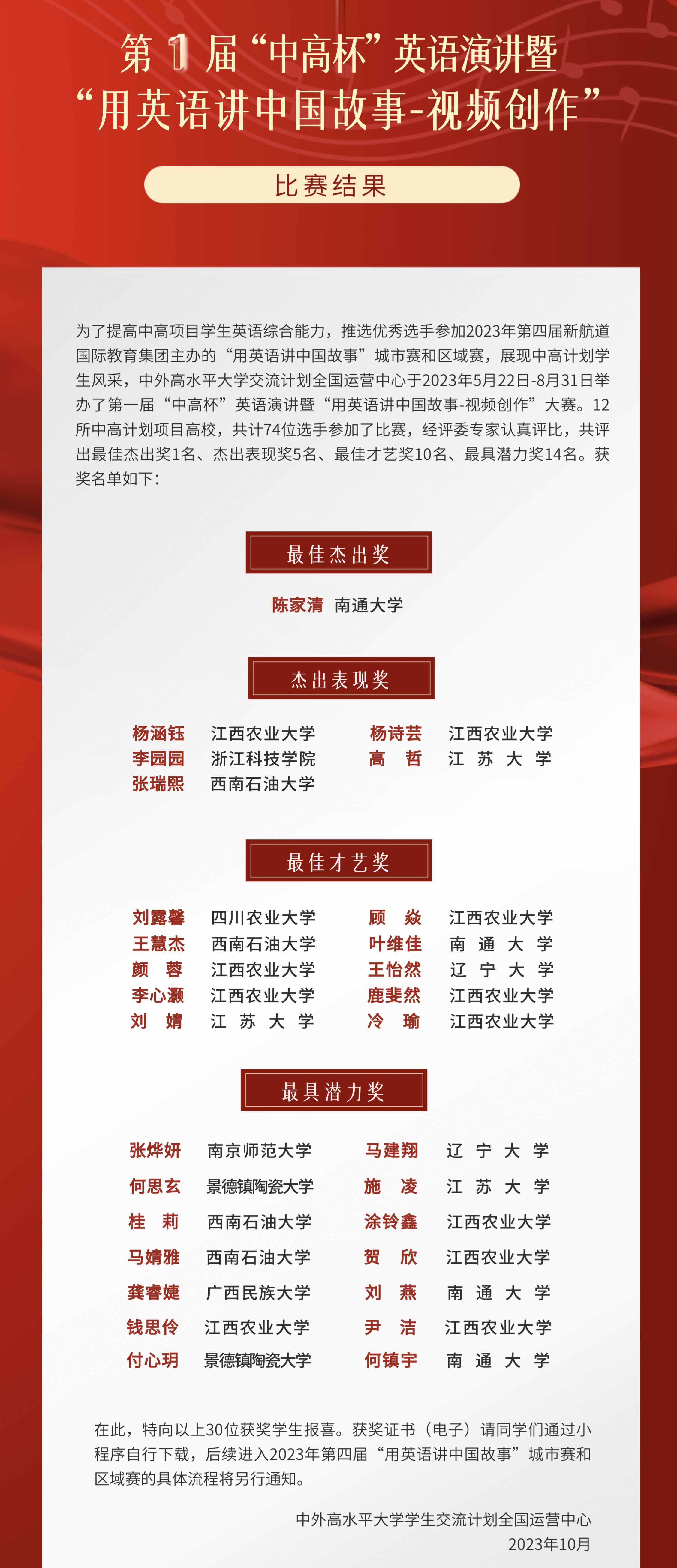 为了提高中高项目学生英语综合能力,推选优秀选手参加2023年第四届新航道国际教育集团主办的“用英语讲中国故事”城市赛和区域赛,展现中高计划学生风采,中外高水平大学交流计划全国运行中心于2023年5月22日至8月31日举办了第一届“中高杯”英语演讲暨“用英语讲中国故事-视频创作”大赛。来自12所中高计划项目高校共计74名选手参加了此次比赛,经专家评审,共评出最佳杰出奖1名,杰出表现奖5人,最佳才艺奖10人,最具潜力奖14名。