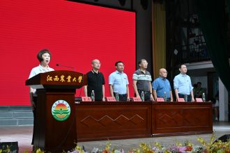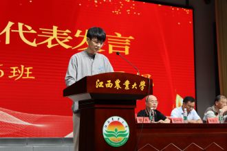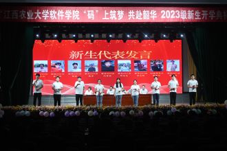 教师代表杨红云教授,老生代表、“江西省最美大学生”刘磊锟和新生代表先后作了发言,院领导为2023级新生代表佩戴校徽。