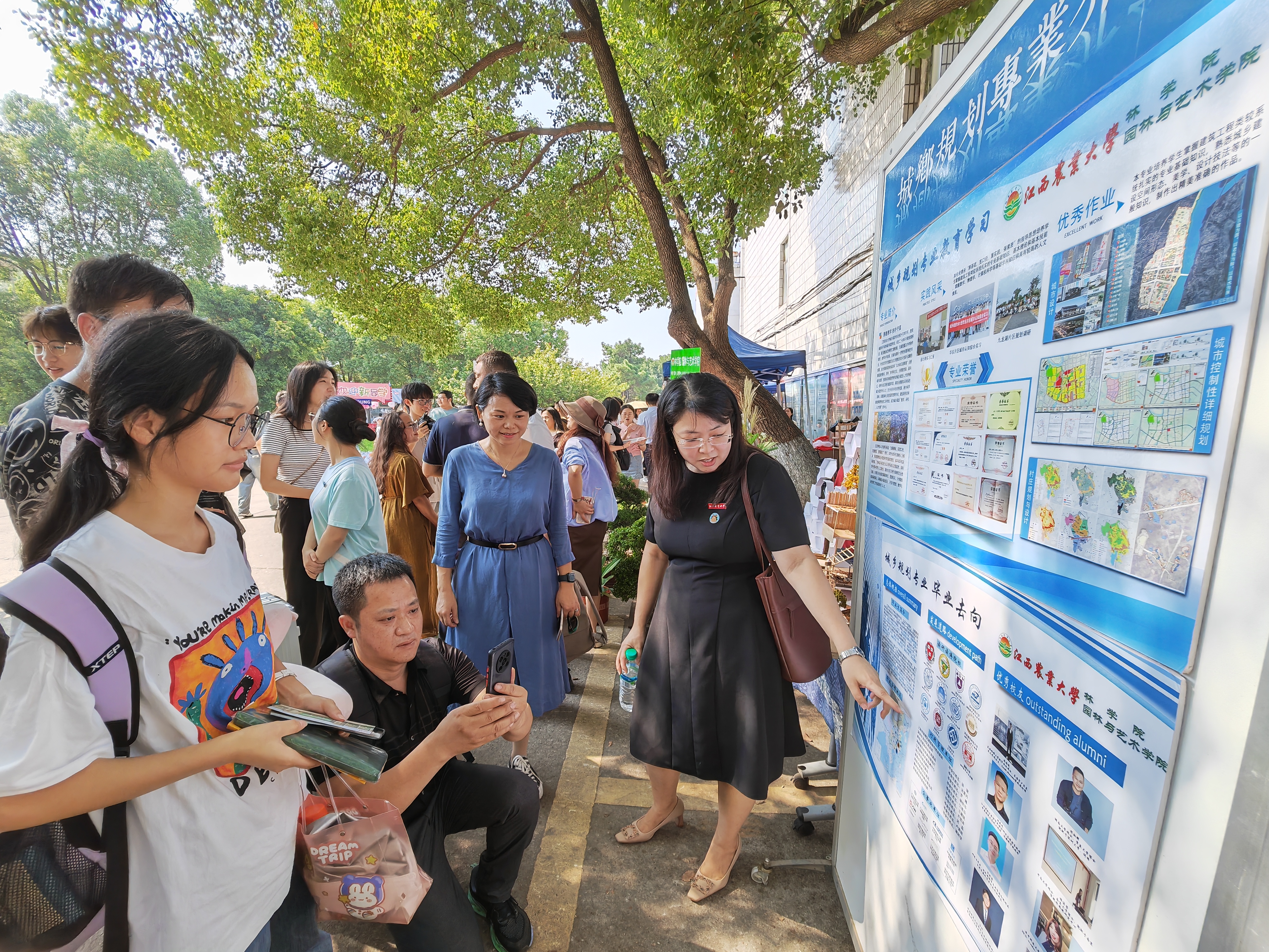 专业介绍齐亮相,上好专业导学课。“我们的毕业生中有首席设计师,也有公务员和高校教师。”学院副院长李媛就大家普遍关注的就业话题与新生及家长热切交流。为激发新生学习兴趣,增进对所学专业的了解,学院今年特地在迎新点增设专业推介展位,各个专业纷纷摆出教学成果、科研突破、创新发明,并配备专业教师现场讲解,新生与家长驻足观看交流,赞不绝口。