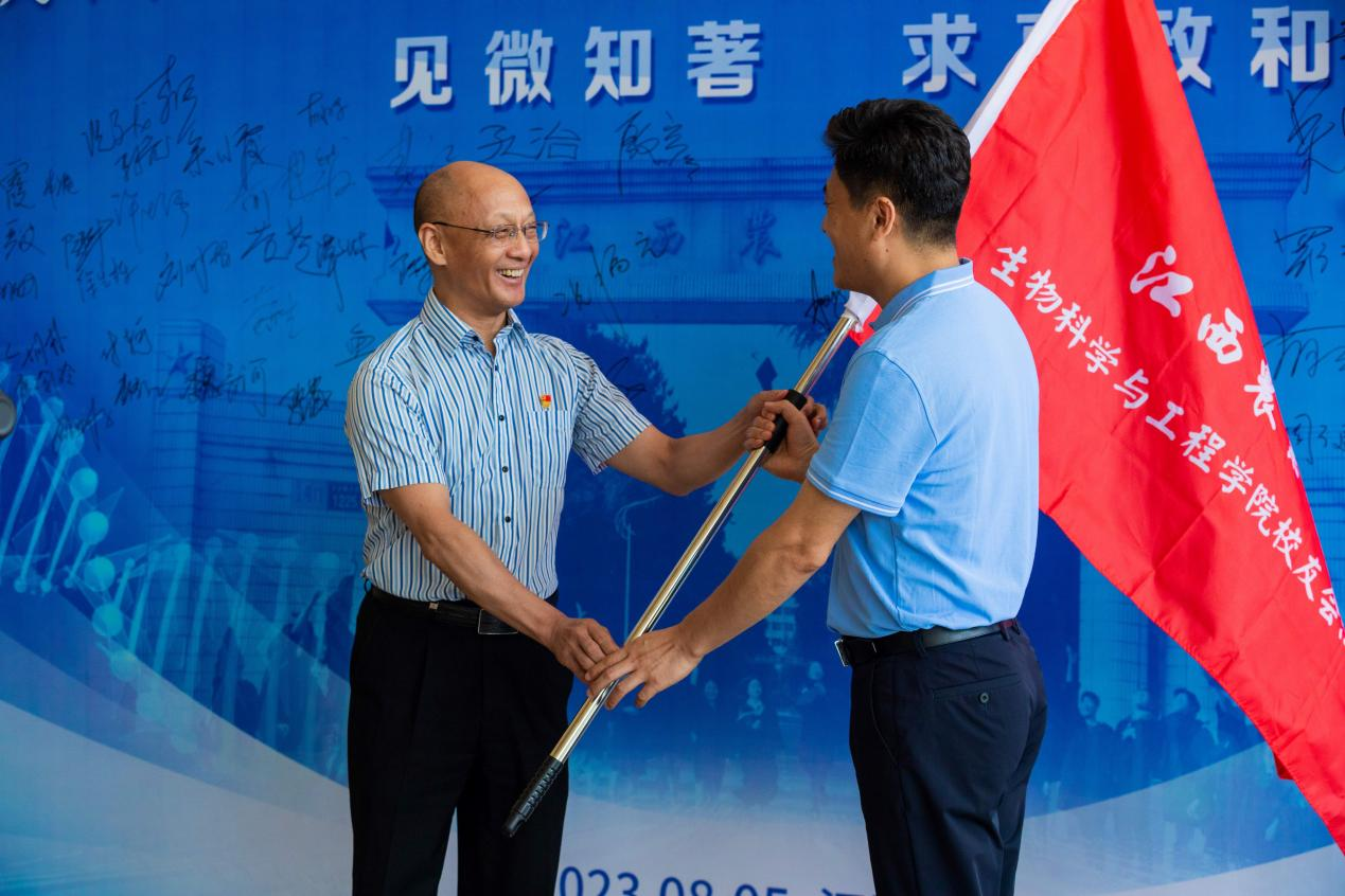 黄路生为生物科学与工程学院校友会江西分会授旗,当选会长吴健代表江西分会接旗。黄路生代表学校向大会的召开表示诚挚的祝贺,对莅临本次大会的校友表示热烈的欢迎,对一直以来情系母校、关心支持母校建设和发展的各位校友表示衷心的感谢,他充分肯定了生物科学与工程学院人才培养的质量和校友工作的成果,向校友介绍了学校的发展前景,并与校友亲切交谈。