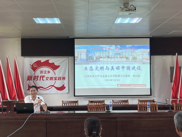 基层一线讲思想。营队指导老师黄以胜博士在沂江乡人民政府,围绕生态文明与美丽中国建设开展理论宣讲,乡村两级党员干部共计30余人聆听。宣讲会上,黄以胜从历史与现实维度回顾了新中国成立以来我国环境保护和生态文明建设的历程,从理论与实践维度分析了全球生态环境保护和我国生态文明建设面临的挑战,从中西对比维度重点介绍了党的十八大以来我国生态文明建设取得的历史性成就。他同时运用塞罕坝、“千万工程”、安吉余村等丰富案例,结合新干生态文明建设的实际,号召乡村两级党员干部不断增强建设美丽乡村的责任感、使命感,走好人与自然和谐共生的中国式现代化之路。