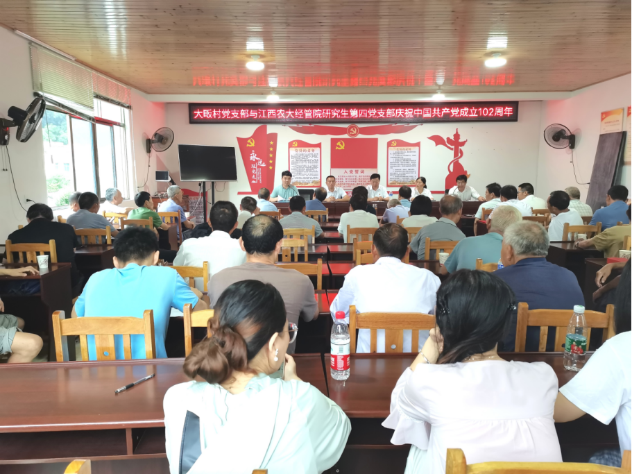 为庆祝中国共产党成立102周年,重温党的光辉历史,赓续党的优良传统,充分发挥党支部的战斗堡垒作用和党员的先锋模范作用,7月1日,江西农大经管院研究生第四党支部与婺源县江湾镇大畈村党支部联合举办庆祝建党102周年暨“政治生日忆初心,勇担使命强党性”主题党日活动。