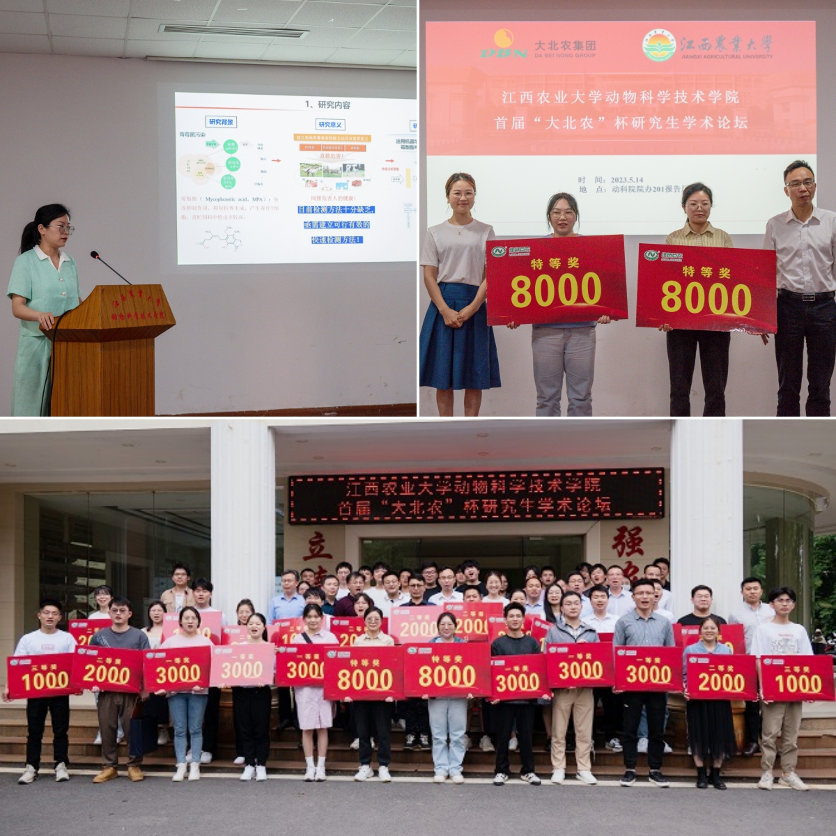 2023年5月14日,动物科学技术学院与大佑吉中南平台共同举办的首届“大北农”杯研究生学术论坛在院办201报告厅顺利举行。本届论坛邀请到胡国良教授、王文君教授、游金明教授、吴国平教授、幸宇云研究员、黎观红教授、大佑吉集团中南平台健康管理中心总监库旭钢博士和大佑吉集团中南平台育肥技术部总监张福刚担任决赛评委指导老师,同时出席参加本次论坛的还有动物科学技术学院党委书记王义华、党委委员副院长郭小权,大佑吉集团中南平台副总裁王凯元和创业人才中心总监谈慧敏等一行,以及动物科学技术学院全体研究生参加。