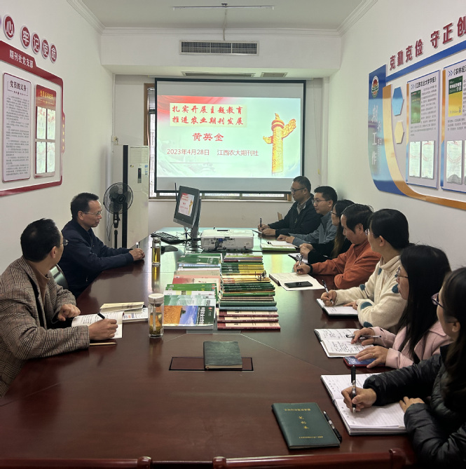 为深入学习贯彻习近平新时代中国特色社会主义思想,4月28日上午,校党委委员、副校长黄英金深入期刊社党支部,与全体党员交流,并以“扎实开展主题教育,推进农业期刊发展”为题讲授党课。