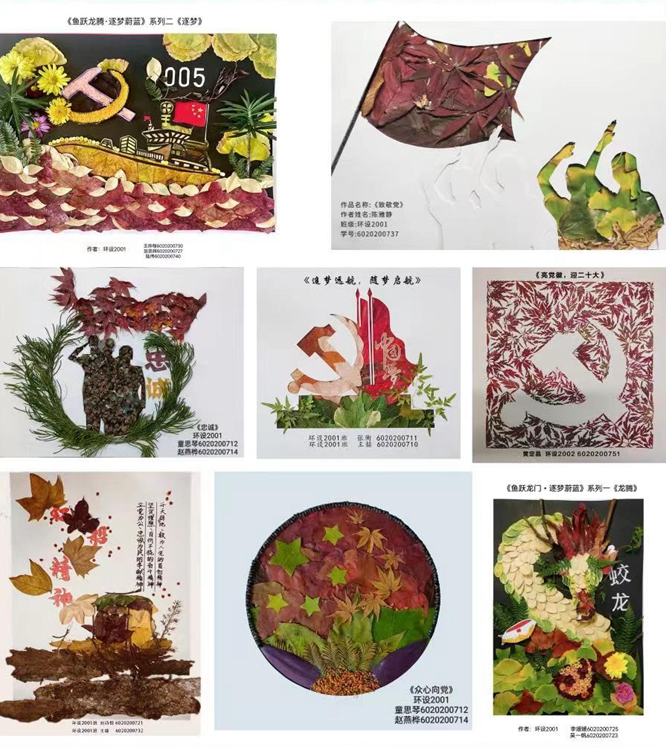 12月12日,园林与艺术学院环设2001和2002班同学在施建敏、张文根两位老师指导下,依托《观赏树木学》课程实验,开展“奋进新征程”主题落叶缤纷树叶拼画展。同学们以植物的枝叶为素材,重塑党徽、党旗、红船等图案,勾勒出了党的百年奋斗历程,作品在校园展出获得众多师生好评。该课程实验是针对环设专业艺术生特点而设计,是进行课程思政和教学创新的一种尝试。