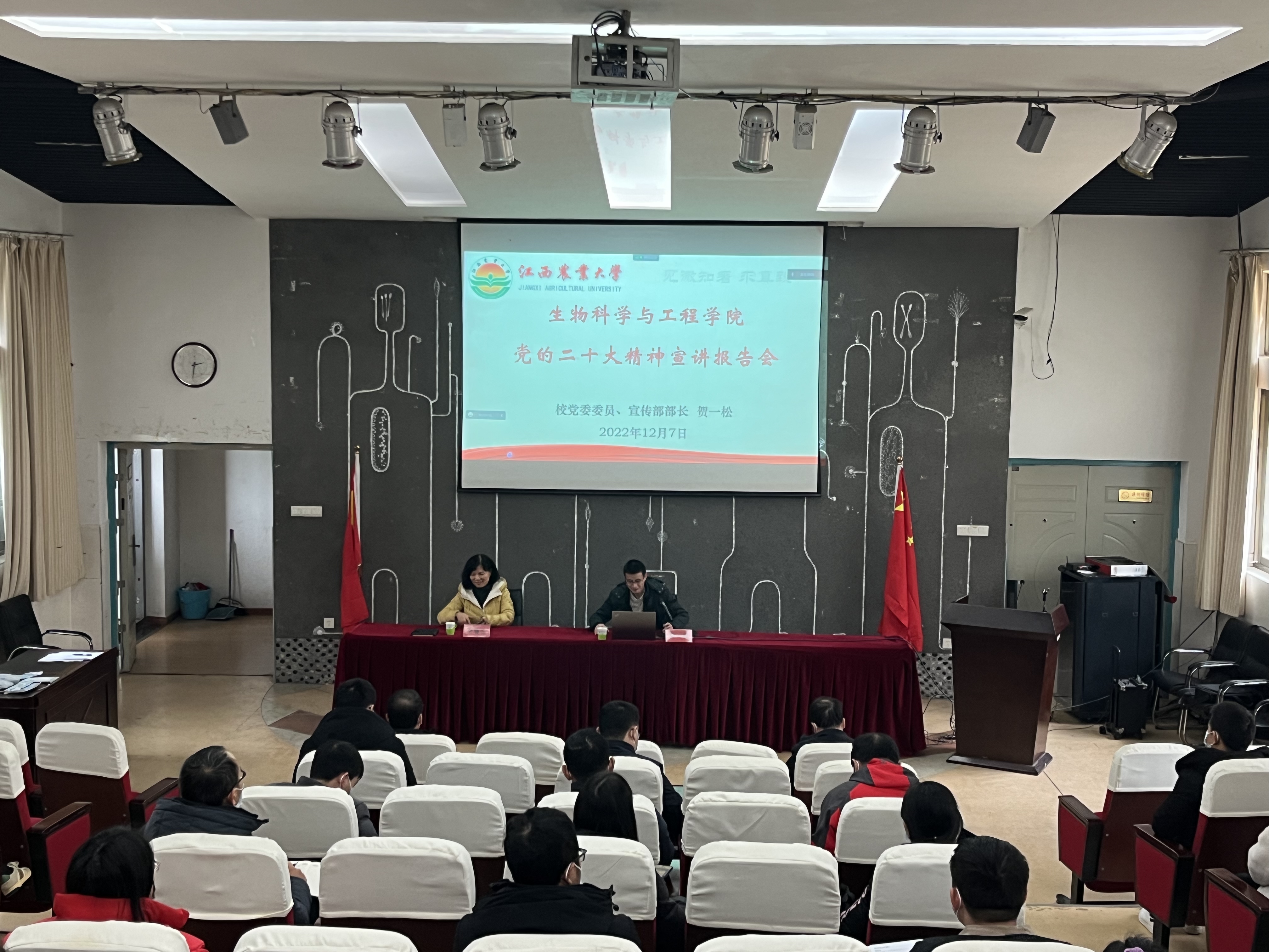 为深入学习贯彻党的二十大精神,12月7日下午,生工学院党委采用线上、线下方式组织开展党的二十大精神宣讲报告会。校“金扁担”宣讲团成员、校党委委员、宣传部部长贺一松作专题报告。学院党政领导班子成员、师生党员、部分学生代表参加报告会。
