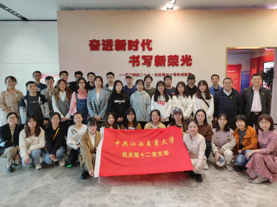 10月25日,机关第十二党支部与联系班级惟义食工2001班带着二十大盛会召开的喜悦和鼓舞,共同来到江西省图书馆参观《奋进新时代 书写新荣光—喜迎党的二十大 苏区振兴十周年成就展》,举办了一次“走出学堂、走进展堂”的特别主题党日活动。