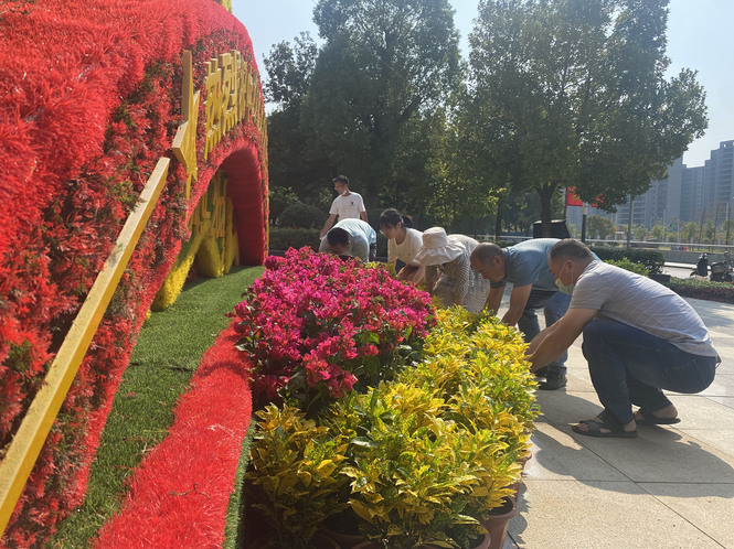 秋日阳光灿烂,校园花团锦簇。为营造国庆节日氛围,喜迎党的二十大胜利召开,9月29日,机关第十一支部全体党员在学校先骕楼南广场、东区大门摆放花卉造型,扮靓校园。支部党员对花卉造型进行设计并制作宣传展板,节日景观氛围在精心布置下一步步呈现出来,大家感受到劳动的光荣和节日的快乐,深情祝福伟大的祖国繁荣昌盛。