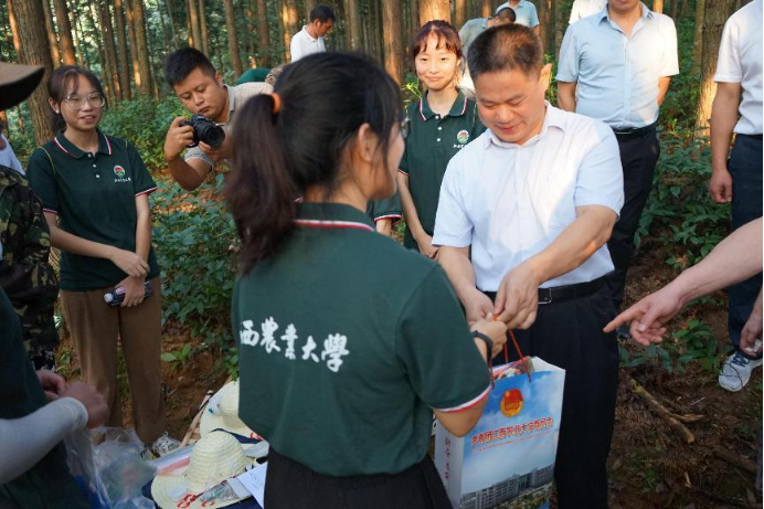 在山苍子和草珊瑚基地,蔡海生与团队师生亲切交流,详细了解他们的衣食住行和工作开展情况,叮嘱同学们要注意防暑和安全。蔡海生指出,暑期“三下乡”社会实践活动是同学们运用知识、施展才华、磨练意志、实践成才的“大课堂”。蔡海生希望,同学们一定要珍惜宝贵机会,发扬勇攀高峰、敢为人先的创新精神和集智攻关、团结协作的协同精神。坚持求真务实、精益求精的科学态度,在实践中磨练意志,增强本领,争做所学领域的“大先生”,同时把自己的所学、所长运用于实践,服务于社会和人民。实践团队指导老师陈尚钘教授汇报了团队的调研情况和创新成果。学生代表宁晓丹分别围绕团队情况、实践内容和实践收获等方面做了汇报。