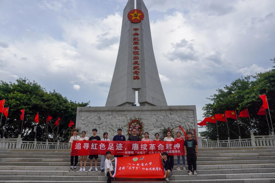于都是红军长征的集结出发地。实践团队在指导老师的带领下先后前往中央红军长征集结出发地纪念园、于都长征第一渡、梓山镇山峰坝渡口、罗坳镇步前村红军第五军团旧址、祈禄山镇红军小道、黄麟乡井塘村中共中央分局、中央政府办事处旧址等重要红色场所,重走红色道路、追溯红色记忆、践行初心使命。“火炬手”红色文化传承志愿服务队的成员们从渡口到小道,从旧址到田间,从草鞋到手术台,一路追寻着红军的脚步,时隔八十多年,推开历史这扇厚重的大门前看到了苏区革命先辈们的伟岸身影,在红色走读中学习红色故事、感受红色文化、传承红色精神。