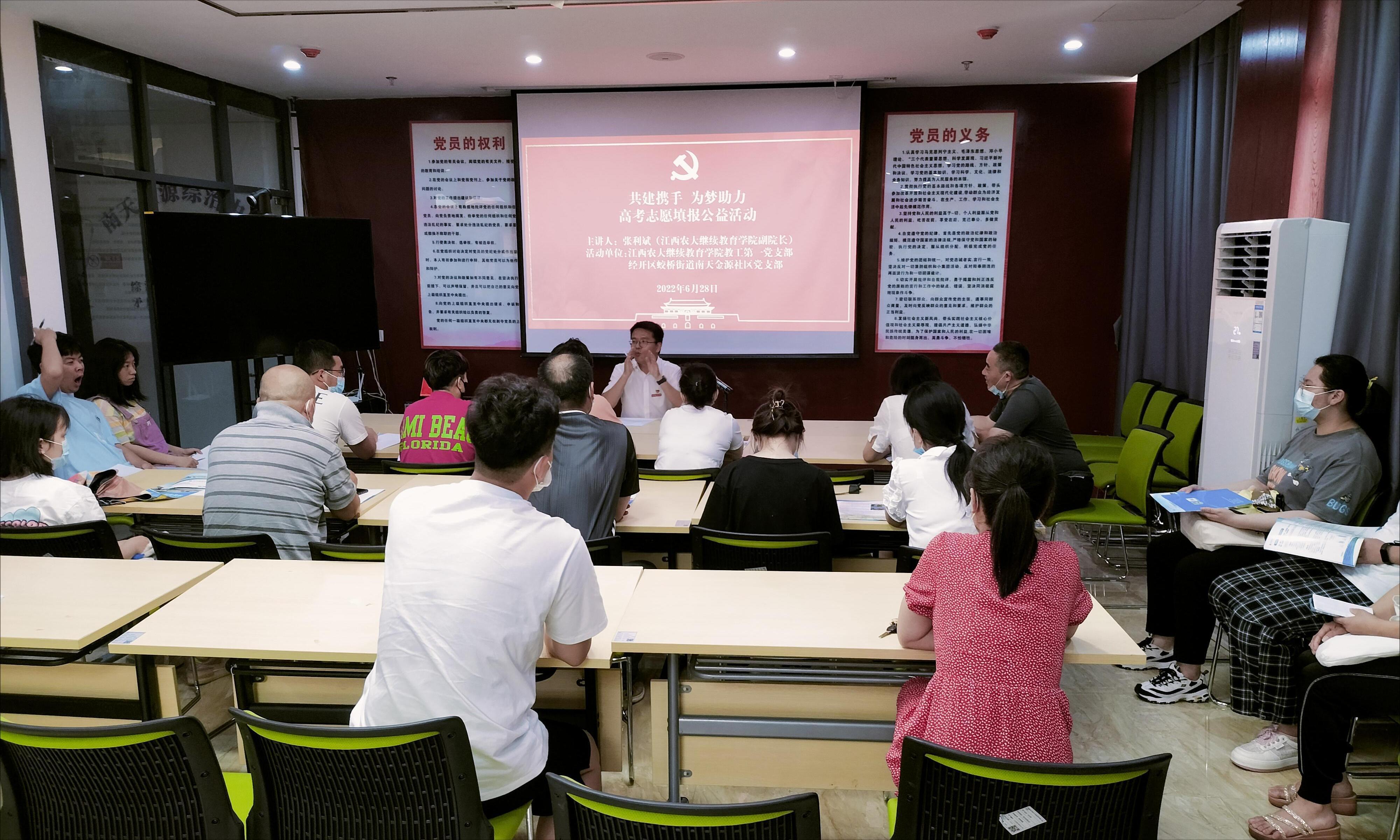 为持续巩固拓展党史学习教育成果,继续深入推进我为群众办实事活动,6月28日上午,继续教育学院教工第党支部充分发挥自身的党员人才优势,经开区蛟桥街道金源社区党支部(共建支部)开展“共建携手、为梦助力”——高考志愿填报公益活动。支部党员张利斌同志为金源社区居民解读高考招生政策并解答高考志愿填报相关问题,指导帮助社区高考生填报好高考志愿,助力学子圆大学梦。两个支部的党员及金源社区居民共50余人参加了活动。