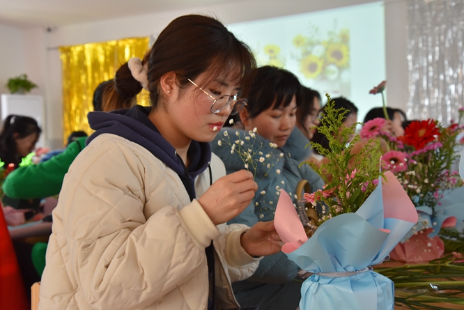 活动上,保育院院长陈凤兰向全体女教职工表达了节日的问候,并向肩负着家庭和工作双重压力,仍兢兢业业奋战在教学、科研、行政等工作第一线的女老师表示诚挚的感谢,鼓励大家积极参与,创作出好的作品。各位女老师踊跃尝试,一支支绚丽的花朵,经过大家的精心的修剪和搭配,变成了一束束赏心悦目的插花艺术品,每一个细节都充满了精致和新意,就如各位老师工作中体现出的孜孜不倦,勇于创新,追求品质的精神。