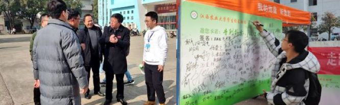 近日,学生校长助理团队 策划组织的以“走出宿舍,走进食堂,走向图书馆,走上运动场”为主题的“四走”系列活动,在校园多地陆续开展,引导青年学生当文明人、说文明话,做文明事,为推进文明校园建设做出了学生校长助理团队的积极贡献。活动第一期“告别外卖,从你我做起”于12月22日在北区大食堂前广场举行,通过万人签名等方式,倡导文明用餐。校长赵小敏亲临活动现场指导,勉励学生校长助理团队提升站位,从建设文明校园的高度,把活动进一步丰富拓展,办成有影响、有实效的系列活动。党办校办主任陈文新、党办校办副主任、发展规划研究中心主任胡永升等老师参与本次活动。学生参与热情高涨,活动取得圆满成功。