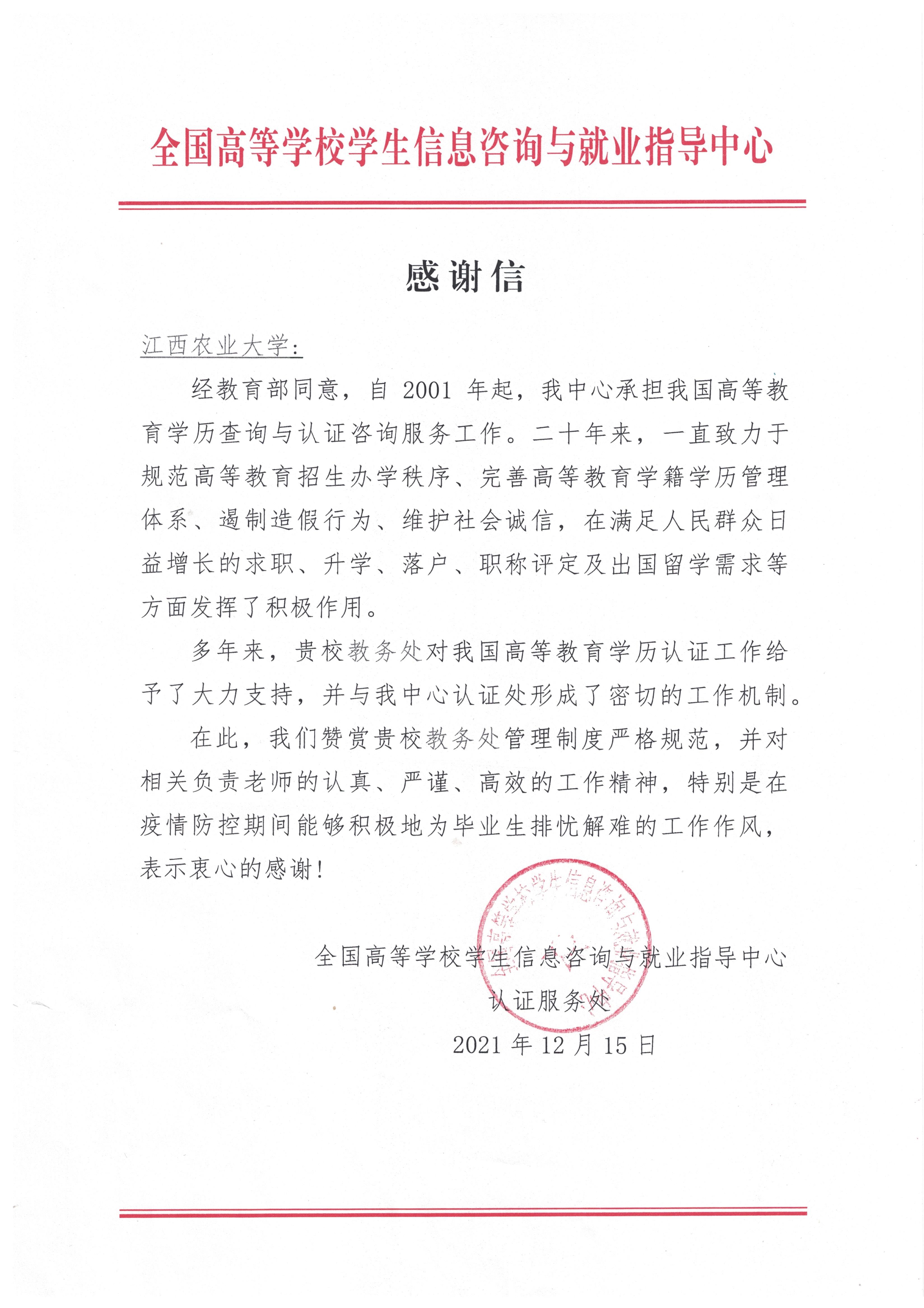 日前,ac米兰教务处收到教育部全国高等学校学生信息咨询与就业指导中心的一封感谢信,对ac米兰教务处认真严谨、高质高效地完成了教育部高等教育学历及成绩认证工作表示诚挚感谢。